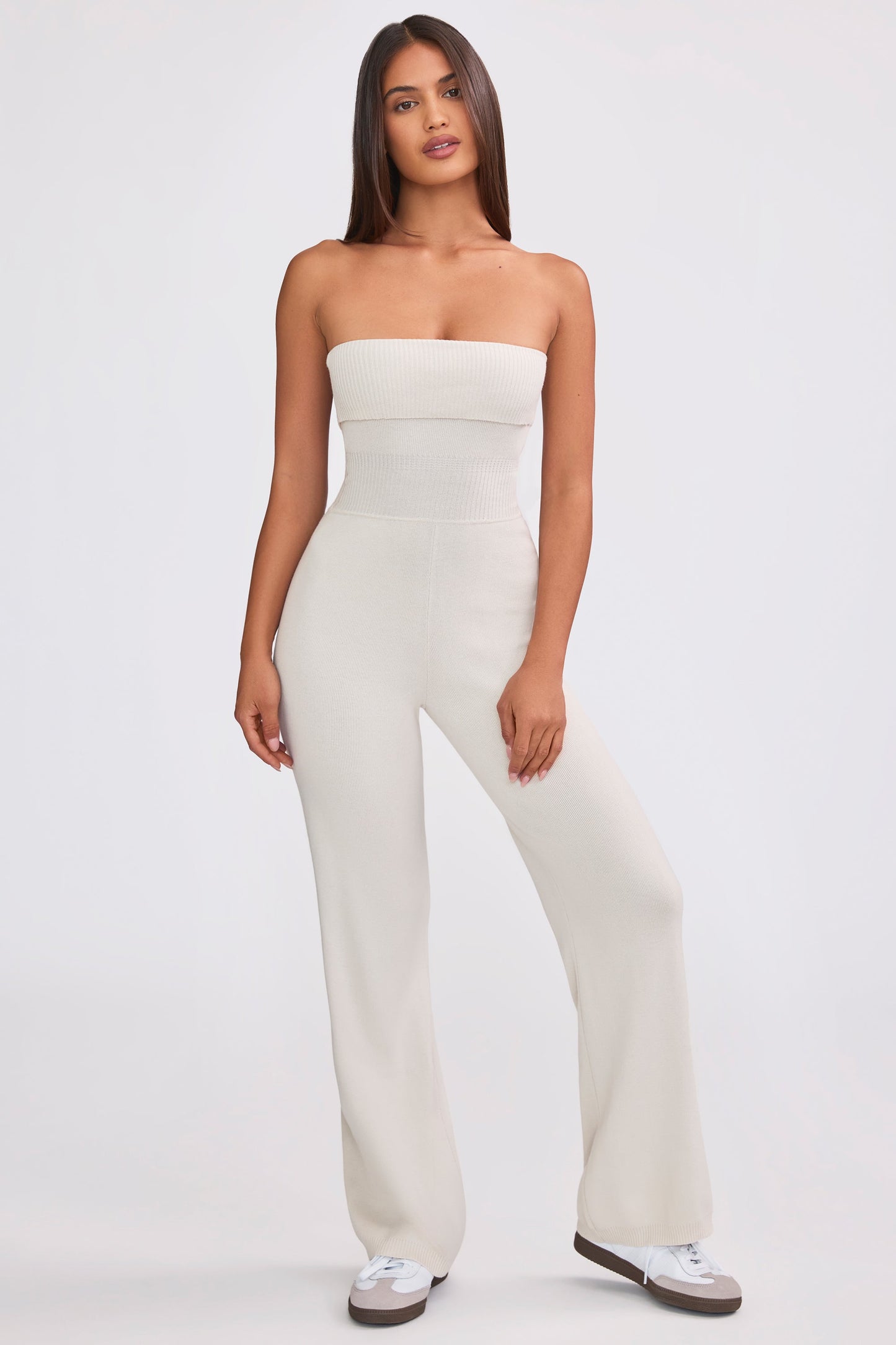 Bandeau Kick Flare Chunky Knit Jumpsuit in Cream