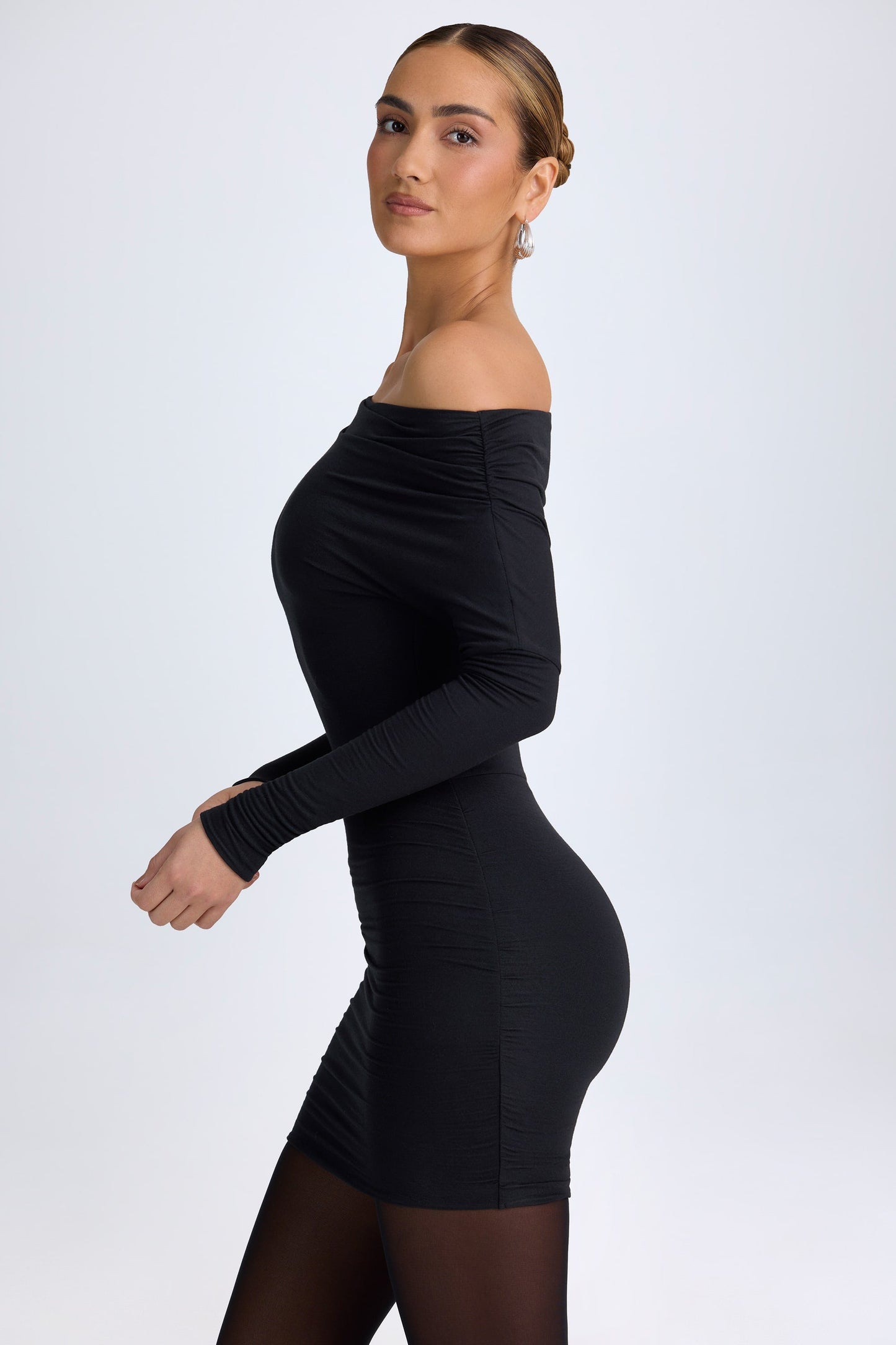 Modal Off-Shoulder Ruched Mini Dress in Black